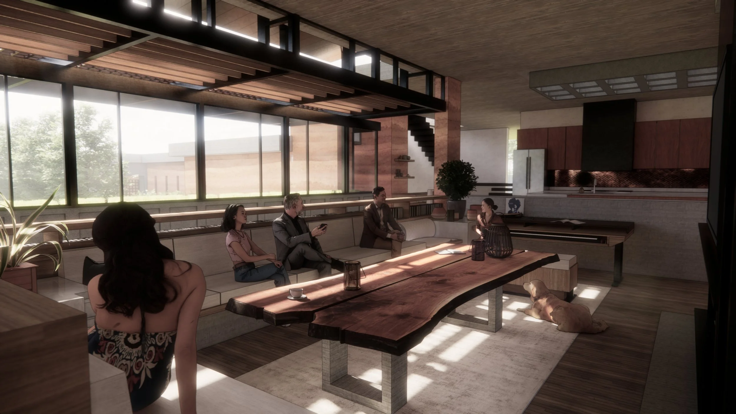 My project consisted of heavy rammed earth walls inspired by a rusty-looking rock that I found on the project site. These walls acted as the root system of the home. Another concept of mine consisted of the kitchen being the core of the house carrying warmth to the rest of the adjacent rooms. The closest room, being the living room, acts as a conductor of this heat as it is the home of the fireplace. The living room is also sunken into the floor forcing the occupant into a humbled and communal spirit. The downward force spreads the energy of the room horizontally to others sitting nearby. All of the furniture was designed myself as I wanted the entirety of the home to sing the same sort of song. The materials are all intertwined with one another and call out to one another like instruments in a small quartet. They are meant to be touched, felt, interacted with. In the end, the home was designed to come out of the earth, as its child almost; enveloped in light and water and dirt it sits at the top of a hill. I was very pleased with the final results and was so excited to present it and my dream to the rest of the firm.